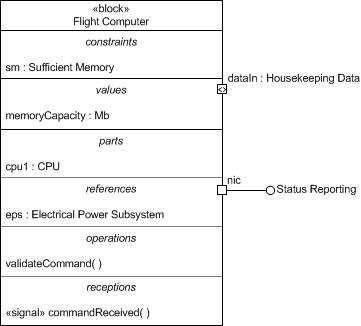 - Constraint blocks—to represent the mathematical model that binds the system’s structures to provide assertions about nominal system behavior