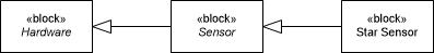 “Abstract” is the term (in SysML) that refers to any element of definition (e.g., block, actor, use case, activity, interaction, state machine) that you create in a system model and declare to be uninstantiable. (I’ll elaborate on this concept in the next paragraph.) “Abstract” is simply a property that you can toggle on and off for any classifier in a system model (where “classifier” is the formal SysML term for any of the various kinds of elements of definition). When you set the “Abstract” property for a classifier in your system model, the name of that element will be displayed in italics on diagrams. The figure above conveys that I’ve set the “Abstract” property for the Sensor block and the Hardware block in my system model.