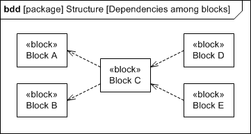 Let me end with a focus on the original topic: dependencies. The key thing to remember about dependency relationships is that you use them in a system model to establish traceability among design elements. Begin with the axiom: change happens. At some point during the system life cycle, you will need to modify your system design. When that moment comes, you can use a modeling tool to perform automated downstream impact analysis. And dependency relationships are one mechanism to achieve that. For example, with the model shown above, I could click on Block A (in a modeling tool window) and query the model to generate a list of dependent elements. In moments, the modeling tool would pop up a search results window that displays the transitive downstream tree of dependent elements: Block C, Block D, and Block E (along with all of the other elements in the system model that depend on Block A that are not shown on the BDD above). The modeling tool removes the cognitive burden on you, the designer, in having to remember which client elements may need to be updated each time you make a change to an element in your design. This is one of the many ways that the practice of model-based systems engineering (MBSE) helps engineers ensure the integrity and consistency of their designs when change happens over the course of the system life cycle. And this is the root of the return on investment that MBSE offers over the traditional document-based approach to engineering.
