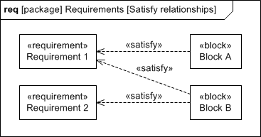 Please remember, once again, that each satisfy relationship is complete by itself. The model shown above conveys that each instance of Block A will satisfy Requirement 1. It conveys also that each instance of Block B will satisfy Requirement 1. This model does not convey that it takes an instance of Block A and an instance of Block B together to satisfy Requirement 1. If that’s what you need to convey, then I would recommend creating a higher-level composite block (i.e., a block with composite associations to Block A and Block B) and then creating a single satisfy relationship from that block to Requirement 1.